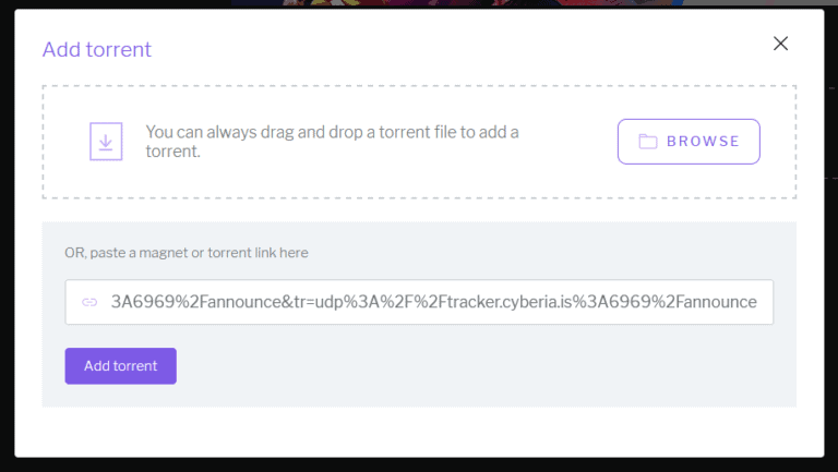- Plak de downloadlink die u van de torrent-site hebt gekopieerd in de map 'plak de magneet- of torrent-link hier"veld. Klik op "Torrent toevoegen.”