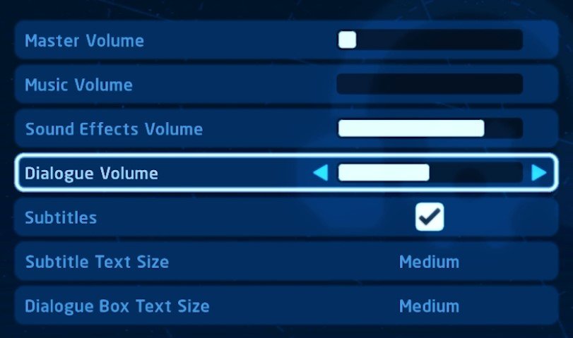 In jouwAudio-opties, kunt u de volumeschuifregelaars voor deMeester,Muziek,Geluidseffecten,EnDialoogvolume. U kunt hieronder ook de tekstgrootten van de ondertitels en dialoogvensters wijzigen. Deze opties komen neer op persoonlijke voorkeur.