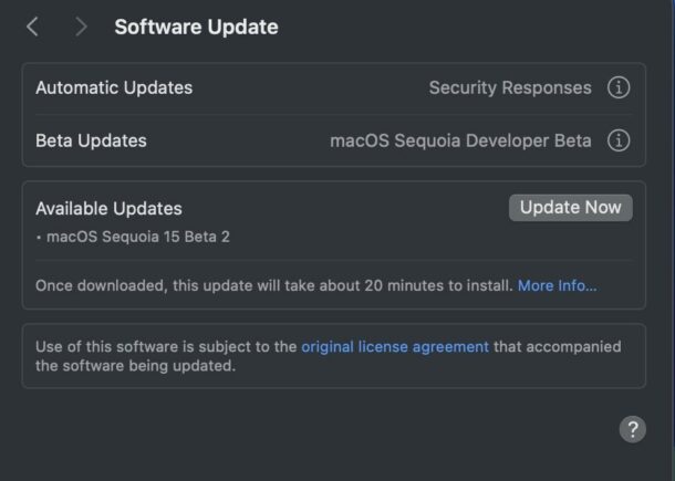 - Selecteer “Nu bijwerken” voor MacOS Sequoia 15 ontwikkelaarsbèta 2 om de nieuwste bèta-update te downloaden en te installeren