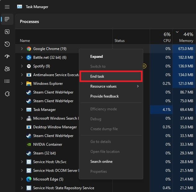 Vervolgens moet u ervoor zorgen dat er geen toepassingen van derden zijn die crashproblemen veroorzaken met Modern Warfare 2 op uw pc. Open uwTaakbeheer. In deProcessentabblad, ga verder met het beëindigen van actieve programma's, die uw gamebestanden kunnen wijzigen, uw VRAM kunnen opgebruiken of een overlay kunnen weergeven tijdens het spelen van de game. In mijn geval kan dit de Creative Cloud-app, Discord of CCleaner zijn.