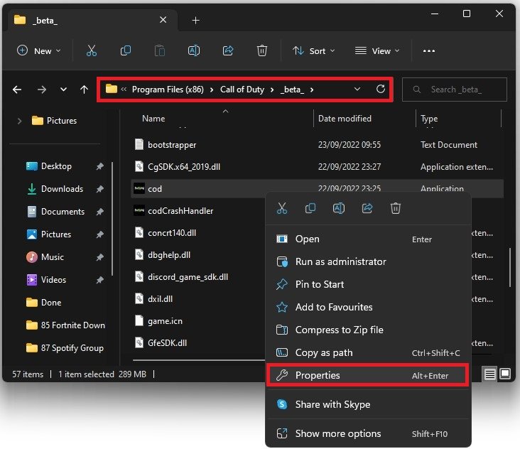 Open uw bestandsverkenner als het crashprobleem aanhoudt met Modern Warfare 2. Navigeer hier naar de schijf waarop u de game hebt opgeslagen,Programmabestanden>Plichtsroep. Klik vanaf hier met de rechtermuisknop op het Call of Duty-spelproces en selecteerEigenschappen.