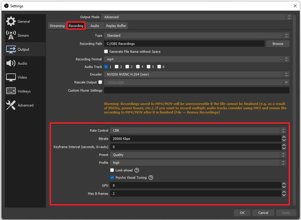 In deOpnamegedeelte van uwUitvoerinstellingen, gebruik .mp4 als uw opnameformaat. Dit neemt niet veel opslagruimte in beslag en stelt u in staat de video met elk videobewerkingssoftware te bewerken. Stel de encoder opnieuw in opNVIDIA NVENC,AMDofx264,afhankelijk van uw grafische kaart en beschikbare bronnen.