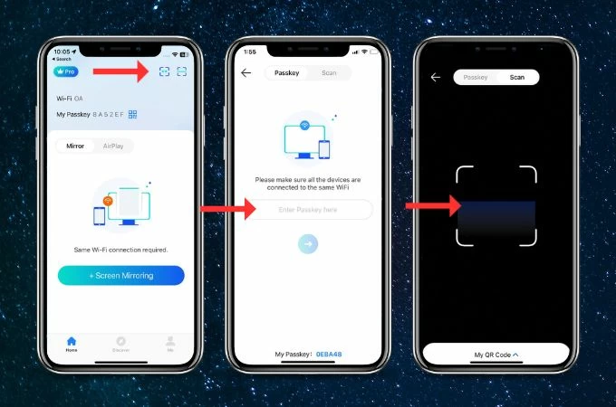 - Open vervolgens de LetsView app op beide apparaten. U heeft twee opties om uw Google Pixel met de tv te verbinden: u kunt de cijfercode invoeren die op de tv wordt weergegeven door op het wachtwoordcodepictogram te klikken, of u kunt de QR-code rechtstreeks vanaf uw tv scannen met behulp van het scanpictogram.