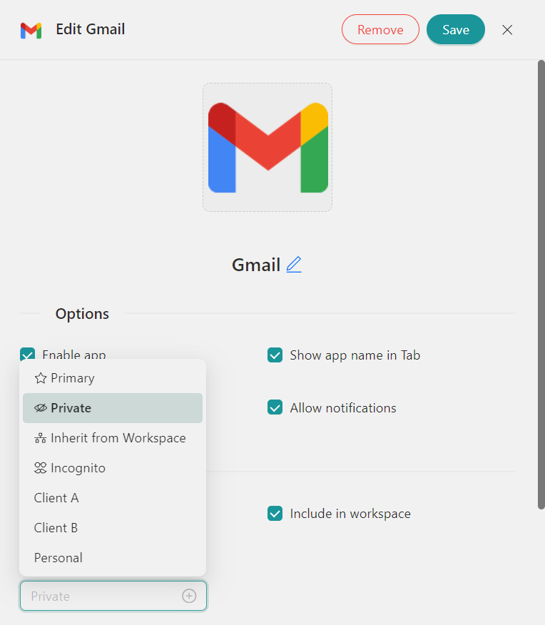 GebruikenProfielen, je kunt creërenafzonderlijke sessies voor elk account en wijs deze toe aan uw apps. Er zijn vijf soorten profielen (Primair, Overnemen van Workspace, Privé, Incognito en Aangepast), zodat u altijd over de juiste configuratie beschikt voor elke behoefte.
