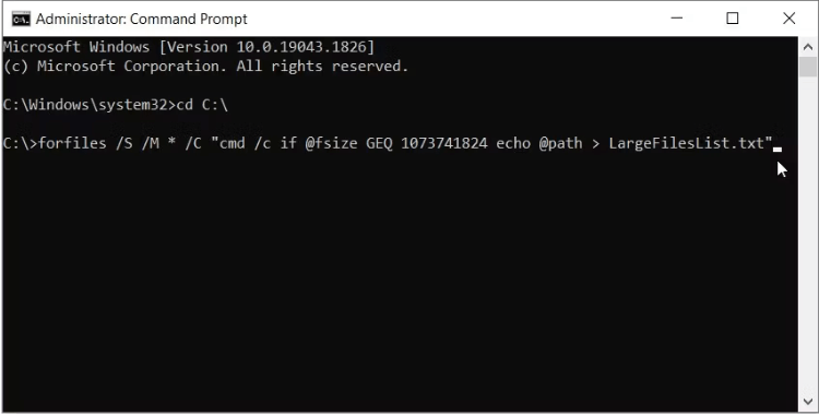 Stap 3.Voer vervolgens “forfiles /S /M * /C “cmd /c als @fsize grootte echo @pad > grote bestanden.txt". Vervang de grootte door de grootte van het doelbestand in bytes (B). Als de bestanden die u zoekt bijvoorbeeld groter zijn dan 1 GB (1.073.741.824 B), typt u "forfiles /S /M * /C “cmd /c if @fsize GEQ 1073741824 echo @path > LargeFilesList.txt' en druk vervolgens op 'Binnenkomen" sleutel.