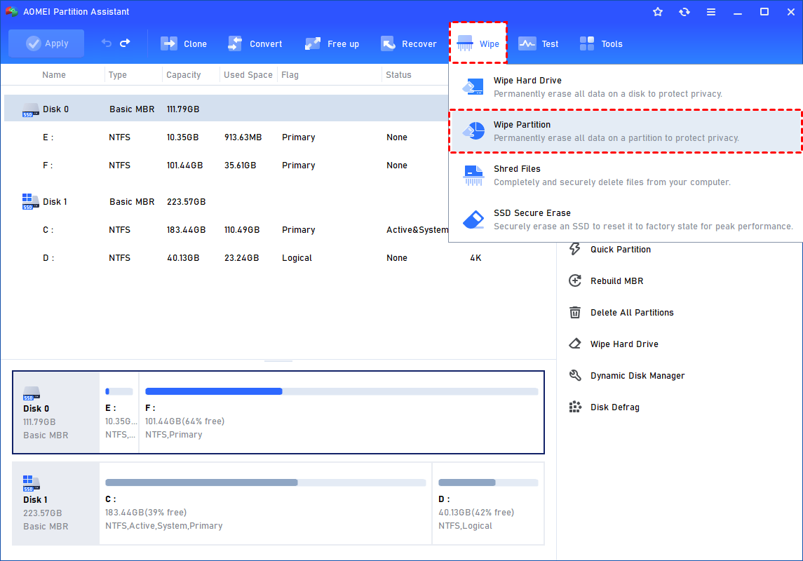 Stap 1.Installeer en start IEMOA Partition Assistant, klik op de“Vegen”hoofdtabblad en selecteer“Partitie wissen”optie. (U kunt ook met de rechtermuisknop klikken op de partitie die u wilt wissen en de“Partitie wissen”optie.)
