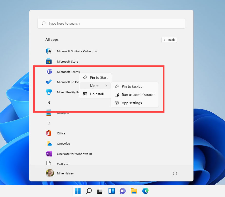 In de rechterbovenhoek van het gedeelte met vastgezette apps bevindt zich een knop Alle apps. Klik hierop om een lijst weer te geven met alle apps die op uw pc zijn geïnstalleerd, alfabetisch weergegeven. Opnieuw kunt u met de rechtermuisknop op een app klikken om deze naar het Startmenu of naar de taakbalk van het Windows-bureaublad te koppelen.