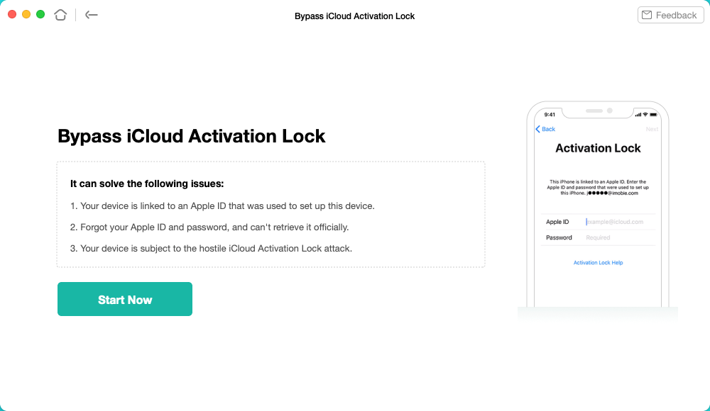 Stap 1.Gratis downloaden AnyUnlock > Start het programma op uw computer > Klik op deOmzeil iCloud-activeringssloten tik op de knop "Nu starten".
