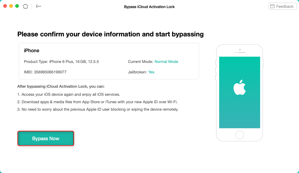 Stap 4.Nadat de jailbreaktool is gedownload, zet u uw iOS-apparaat in de DFU-modus en start u het jailbreakproces. Wanneer het jailbreaken is voltooid, kunt u op klikkenNu omzeilenom het iCloud-activeringsslot op uw apparaat te omzeilen.
