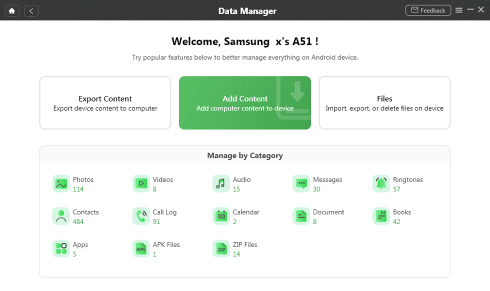 DroidKit kan alle ingewikkelde gegevens die op uw Android-smartphone zijn opgeslagen, overbrengen en deze eenvoudig presenteren door deze in de juiste categorieën te classificeren. De afbeeldingen, films, contacten en documenten van uw mobiele telefoon bevinden zich allemaal op één plek en u kunt het gegevenstype kiezen dat u wilt overbrengen.
