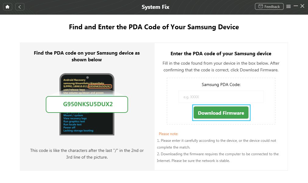 Stap 3. DroidKit komt automatisch overeen met de PDA-code van uw Samsung-apparaat> Klik vervolgensFirmware downloadenom de firmware te downloaden.