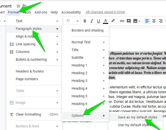 Klikk nå på"Format"menyen igjen og gå tilAvsnittsstiler > Alternativerog klikk på"Lagre som standard stiler".