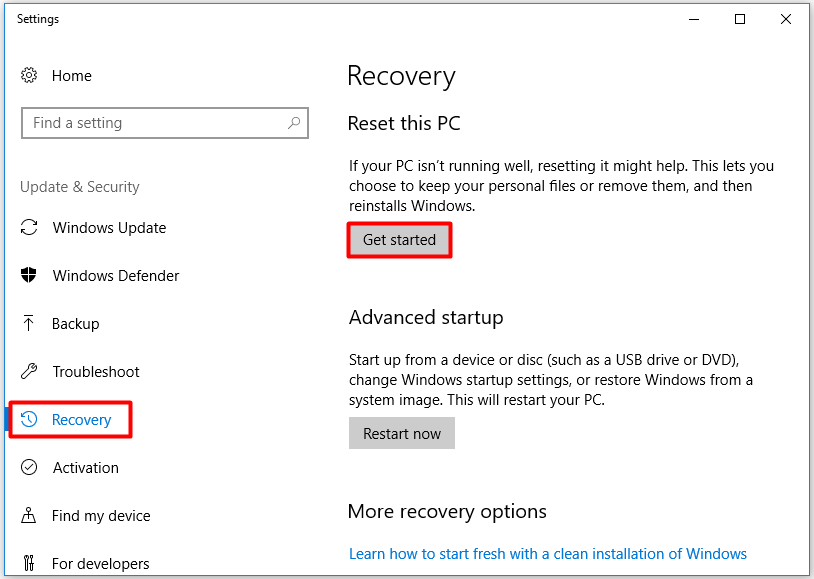 - Przejdź do Aktualizacja i zabezpieczenia > kliknij opcję Odzyskiwanie i kliknij Rozpocznij.