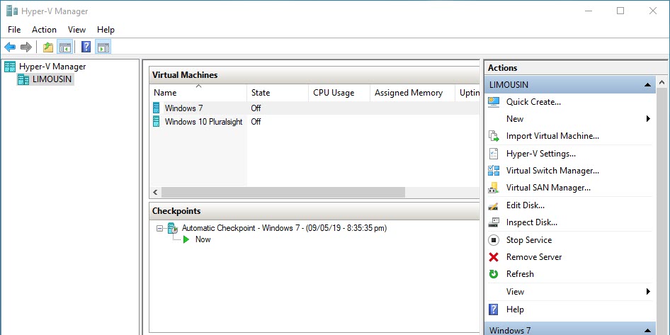 Hyper-V pojawi się następnie w menu Start, a po uruchomieniu zobaczysz, że ma trzy główne panele. Panel po lewej stronie zawiera szczegółowe informacje o zainstalowanym serwerze wirtualizacji (tj. zainstalowanej kopii systemu Windows), panel pośrodku zawiera szczegółowe informacje o wszystkich zainstalowanych maszynach wirtualnych i poniżej oraz zapisane punkty kontrolne dla tych maszyn wirtualnych, a panel po prawej stronie zawiera opcje kontekstowe dla Hyper-V w górnej sekcji i opcje kontekstowe dla wybranej maszyny wirtualnej w dolnej sekcji.