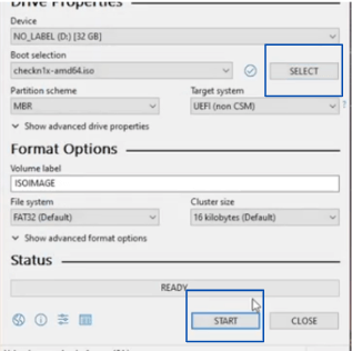 Krok 2:Podłącz dysk USB do komputera. Po pobraniu otwórz oprogramowanie Rufus. Kliknij"WYBIERAĆ"i kliknij pobrany plik checkn1x iOS. Trzask"START."
