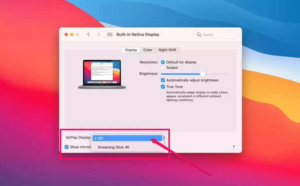 Jeśli na komputerze Mac brakuje ikony AirPlay, możesz ją włączyć, modyfikując niektóre ustawienia. KliknijJabłkoikona > KliknijPreferencje systemowe> WybierzWyświetla> SprawdźPokaż opcje tworzenia kopii lustrzanych na pasku menu, jeśli są dostępne. Teraz ikona AirPlay pojawi się na twoim macOS.