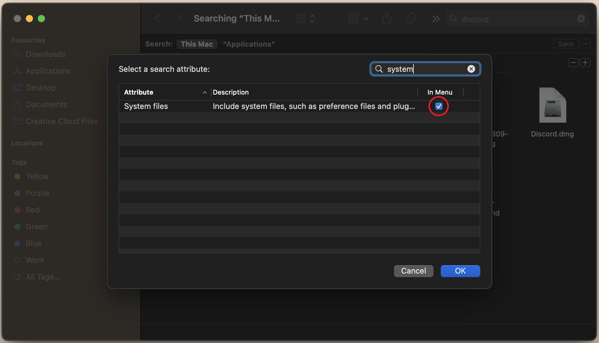 Aby znaleźć więcej plików aplikacji, kliknij ikonę plusa w prawym górnym rogu okna wyszukiwarki. Upewnij się, że pierwsza opcja jest ustawiona naInny, co pozwala sprawdzićPliki systemowei dodaj go do poprzedniego menu.