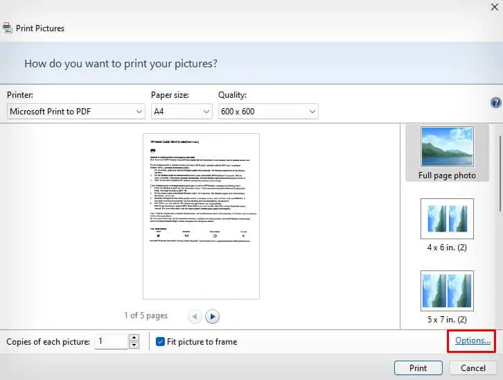 - Na nowymDrukuj zdjęciaokno, wybierzMicrosoft Drukuj do formatu PDFwDrukarkarozwijane.
