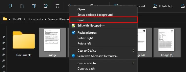 - Gdy pliki są nadal w wybranym trybie, umieść wskaźnik myszy nad pierwszym zeskanowanym plikiem (obrazem), kliknij go prawym przyciskiem myszy i wybierzWydrukować.