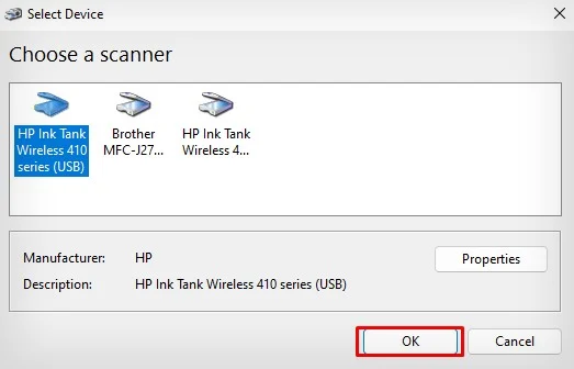 - Wybierz drukarkę lub skaner > kliknijOK.