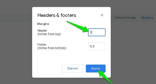 Aqui entre“0”(zero) na caixa de texto ao lado de"Cabeçalho"e depois clique em"Aplicar".