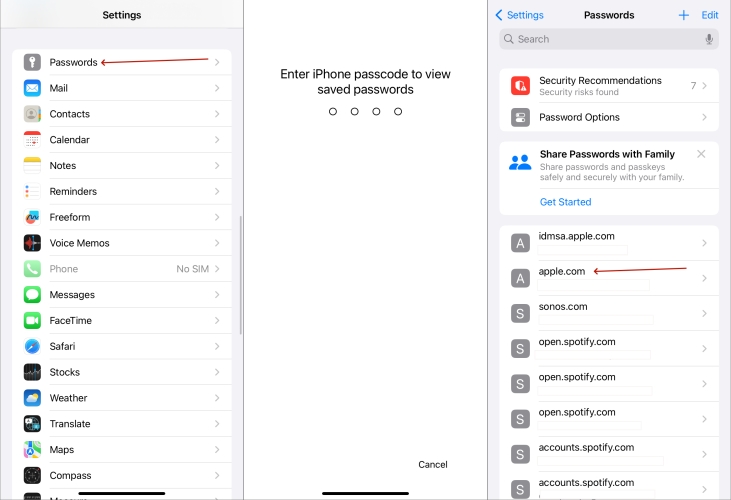 Etapa 3.Entre na tela de senha com Face ID ou senha. Escolha um site na lista e clique nele.