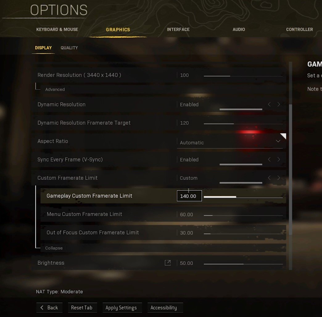 Defina oLimite de taxa de quadros personalizadoparaPersonalizadoe expanda suas opções de FPS. Vamos definir o nossoTaxa de quadros personalizada de jogabilidade Limitepara 140, pois tudo acima seria um desperdício de desempenho para o nosso PC. Você vai querer definir esta opção acima do seuAlvo de taxa de quadros de resolução dinâmica,mas abaixo do FPS máximo, você consegue. OLimite de taxa de quadros personalizado do menudeve ser definido para cerca de 60, e oFPS fora de focoa opção será definida como 30 por padrão, o que é mais que suficiente.