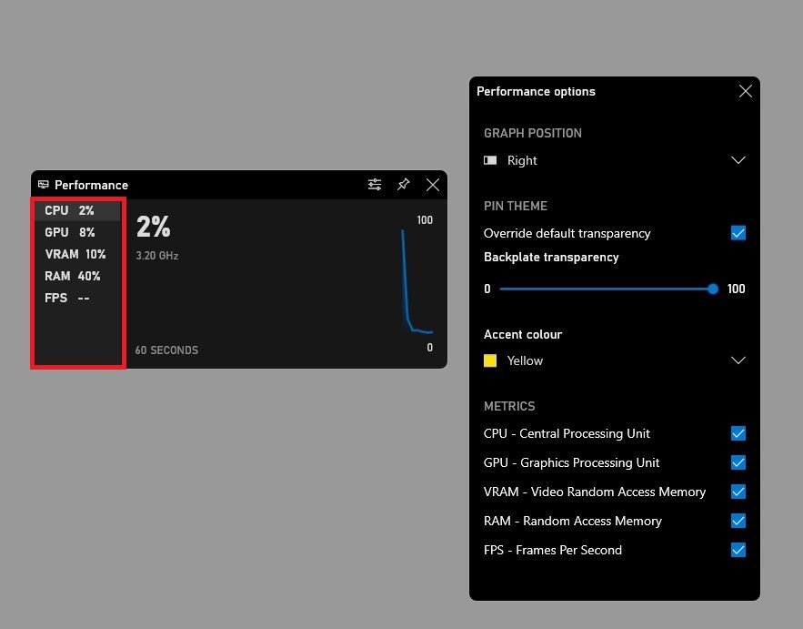 Se você deseja visualizar a utilização de CPU e GPU durante o jogo, sugiro usar o software integradoBarra de jogos Xboxsobreposição. Ao usar o atalhoTecla Windows + G, você pode fixar a janela de desempenho em qualquer lugar da tela e, ao usar o atalho novamente, ela permanecerá na tela principal. Você pode visualizar seuCPUeGPUutilização em porcentagem e seuVRAMeBATERuso.