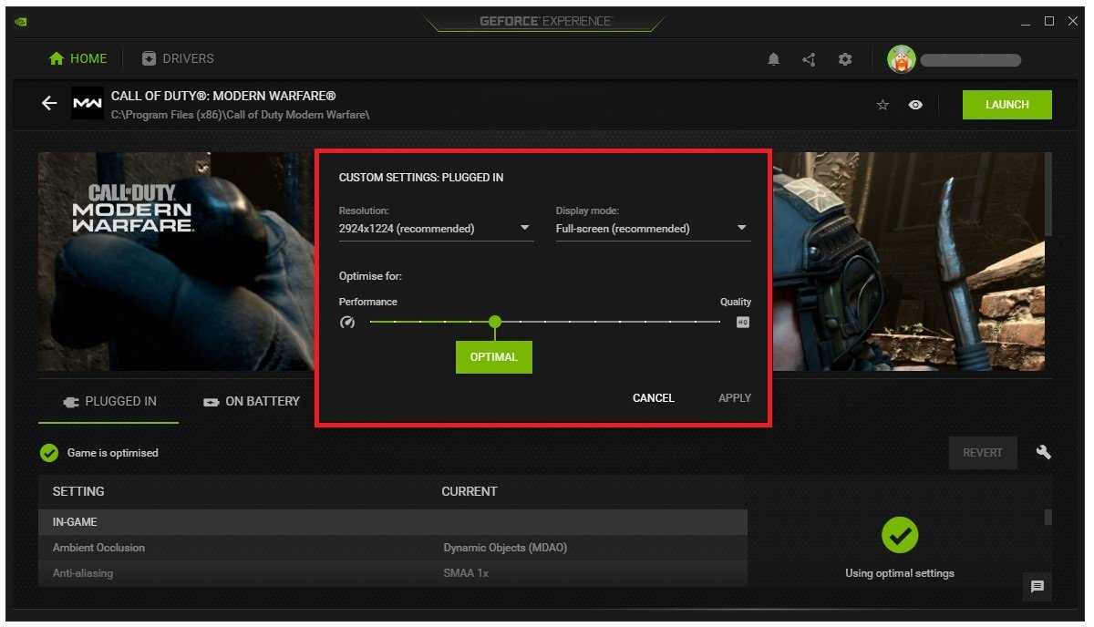 GeForce Experience > Página inicial > Call of Duty Modern Warfare > Configurações personalizadas