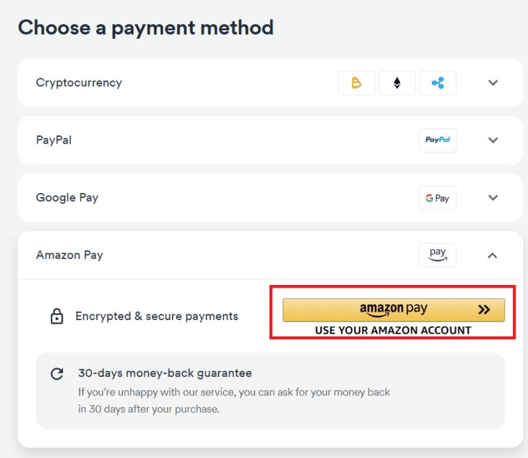 Alternativamente,comprar o Surfshark através de seu site oferece uma opção de pagamento Amazon Pay. Então, você deveriafinancie sua conta Amazon Pay com um cartão-presente antes da compra da VPN.