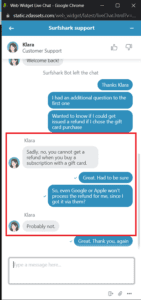 - O Surfshark não é responsável por lidar com solicitações de reembolso por meio do método de pagamento com cartão-presente oficialmente suportado (móvel). Em vez disso, você terá que entrar em contato com seu comerciante (Google ou iOS) para obter um reembolso.