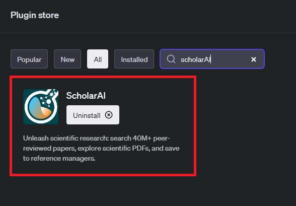 Para habilitar o plugin ScholarAI, visite chat.openai.com e certifique-se de estar usando GPT-4 com plugins habilitados. Em seguida, navegue até a loja de plugins e pesquise “ScholarAI”. Instale e habilite-o na seção de plug-ins instalados.