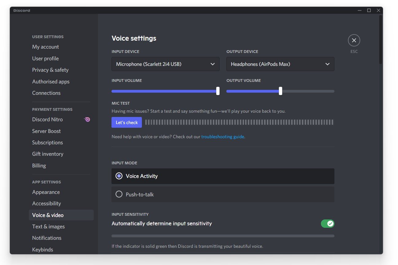 Em seuVoz e Vídeoconfigurações, verifique se o seuDispositivos de entrada e saídaestão configurados corretamente. Ajuste sua entrada e saídaVolume, e abaixo, você pode testar seDiscórdiacapta qualquer volume do seu microfone. Defina oModo de entradaopção paraAtividade de voz, que abrirá seu microfone assim que um limite de volume for atingido.