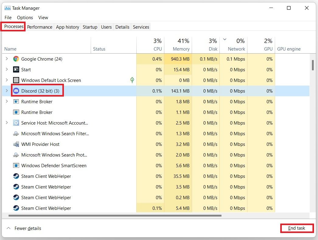 Antes de ajustar seu sistema operacional, sugerimos redefinir sua sessão do Discord. Para fazer isso, saia do aplicativo usando o seuGerenciador de tarefas. Pesquise o Gerenciador de Tarefas na pesquisa do menu Iniciar para abri-lo. NoProcessosguia, localize os processos do Discord e impeça sua execução.