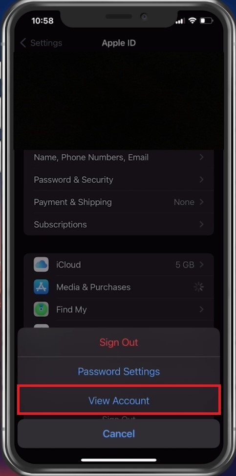 Caso nada tenha ajudado, volte para as configurações do iPhone. Aqui, toque no seuID Applenome e selecioneMídia e compras,e entãoVer conta.