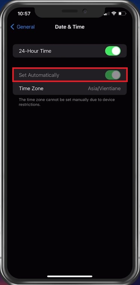 Navegue até o seuEm geralconfigurações. Aqui, toque emData e horae certifique-se de que oDefinir automaticamenteopção está habilitada. Se desativado, seu dispositivo iOS pode impedir que sua conta faça compras na App Store ou desativar completamente sua conta.