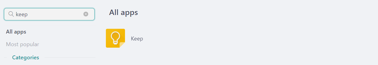 - Digite “Keep” na barra de pesquisa e selecione “Google Keep”.