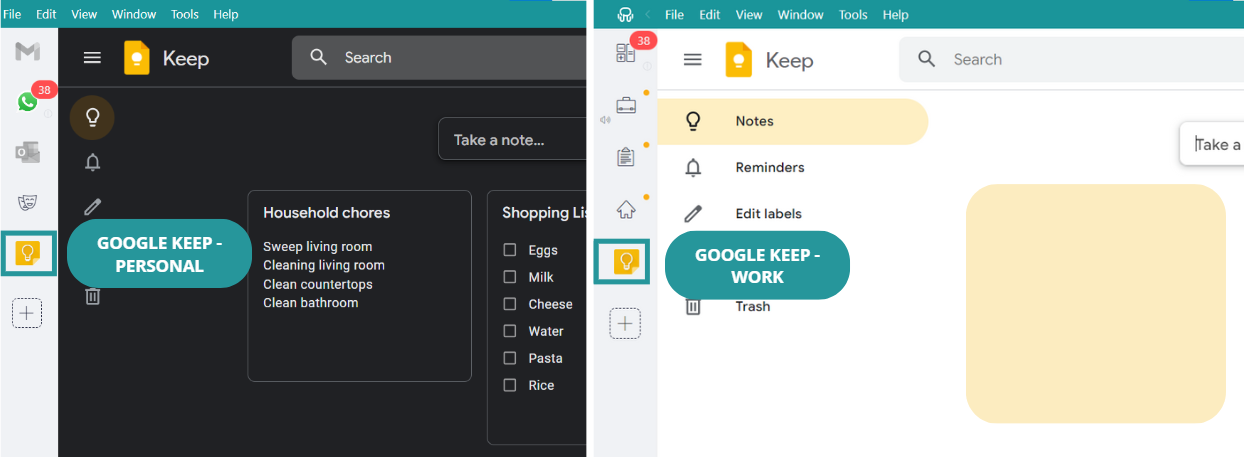 - Espaços de trabalho Rambox: Este recurso é a melhor maneira de organizar sua área de trabalho. Se você usa o Google Keep para tarefas pessoais e de trabalho, o Rambox ajuda a manter tudo organizado. Por exemplo, você pode criar dois espaços de trabalho separados: um para seus aplicativos pessoais, como Google Keep, WhatsApp, etc., e outro para aplicativos de trabalho, como Google Keep para tarefas de trabalho, Slack ou Teams. Dessa forma, suas anotações e lembretes ficam perfeitamente ordenados entre a vida pessoal e profissional.
