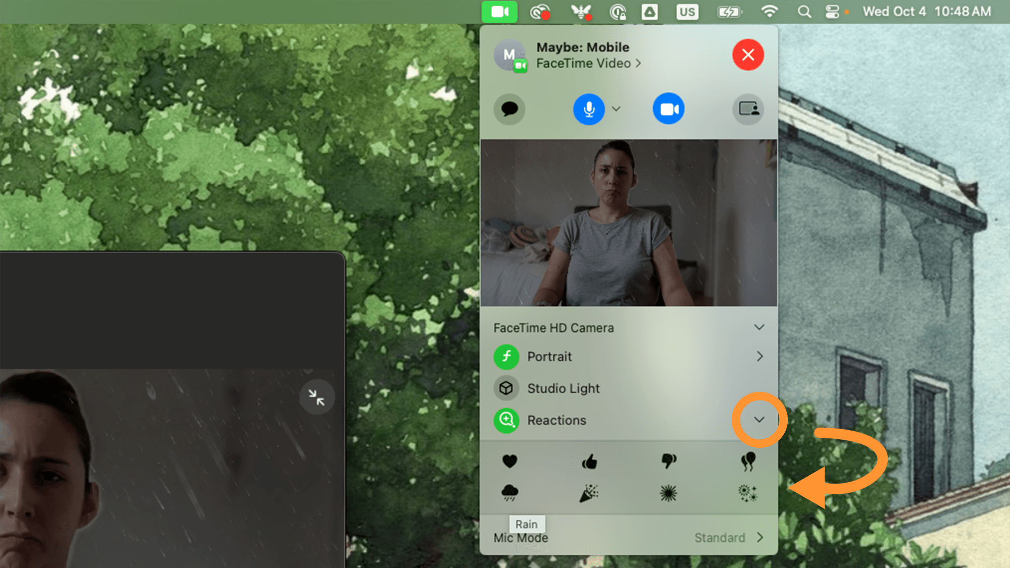 Se você gosta das reações animadas, mas não está disposto a tentar (e falhar) acionar um efeito na frente dos seus colegas, basta pular os gestos. Durante uma videochamada, abra oMenu de vídeona barra de navegação principal do macOS. No menu emergente, clique na seta ao lado deReaçõese você verá um menu rápido de emojis que pode selecionar – esses são os mesmos que você pode acionar com gestos manuais.
