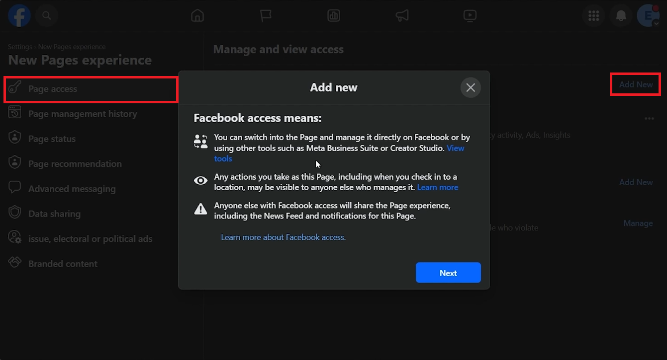 A concessão de acesso total permite que o novo administrador possa removê-lo ou excluir a página. É mais seguro manter esta opção desativada, a menos que seja absolutamente necessário.