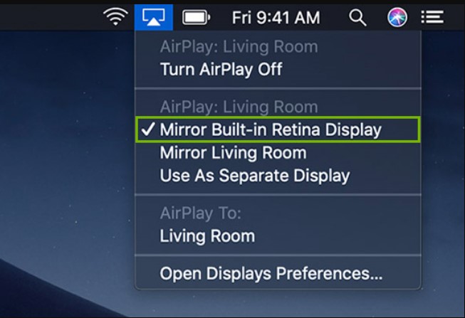 3. Clicando emTela Retina Integrada em Espelhomostrará o conteúdo da tela do Mac para a sua Apple TV.