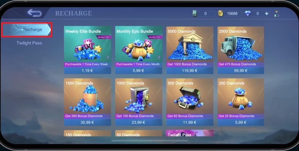 Mobile Legends > Recarregar diamantes