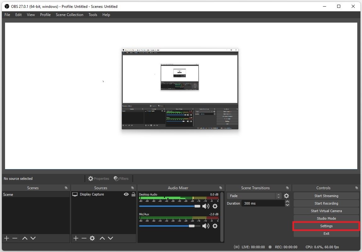 Abra o OBS Studio. Na janela, navegue até o seuConfigurações.