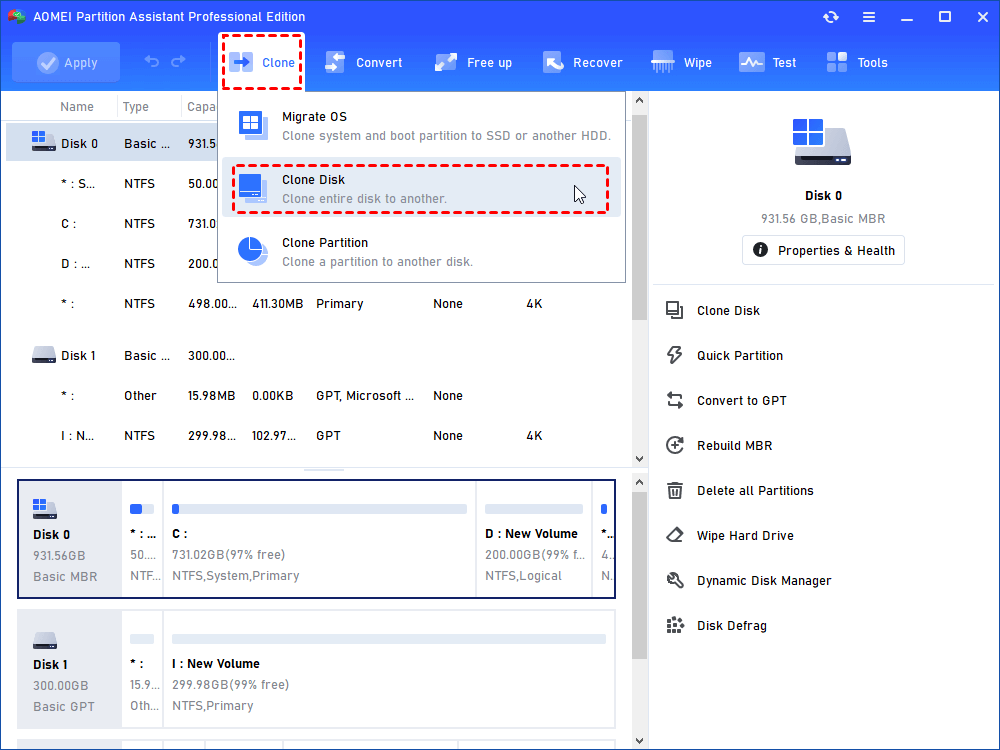 Esta ferramenta versátil pode ampliar mais canais para substituição da unidade de inicialização do Windows 11. Ao usar o recurso Clone Disk, você pode clonar rapidamente todos os dados da unidade antiga para o novo disco, incluindo o sistema operacional, programas e arquivos. Este recurso fácil de usar pode até realizar automaticamente o alinhamento de 4K para SSD no processo de clonagem para melhorar ainda mais o desempenho do SSD.