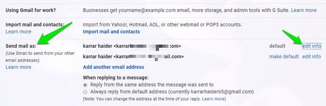 Aqui no“Enviar e-mail como”seção, clique no“editar informações”link ao lado do endereço de e-mail para o qual você deseja alterar o nome.