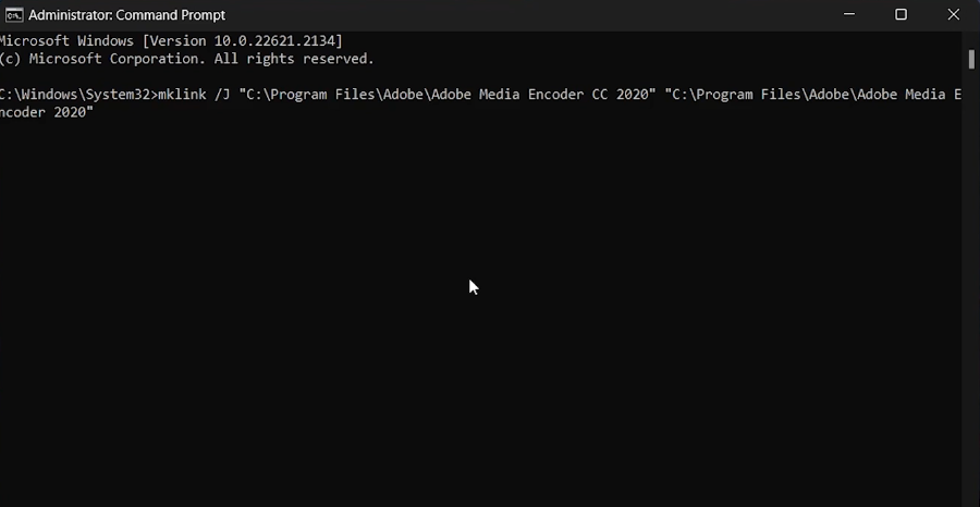 Comando Colar:Uma vez dentro do Bloco de Notas, cole este comando:mklink /J “C:Arquivos de programasAdobeAdobe Media Encoder CC 2020