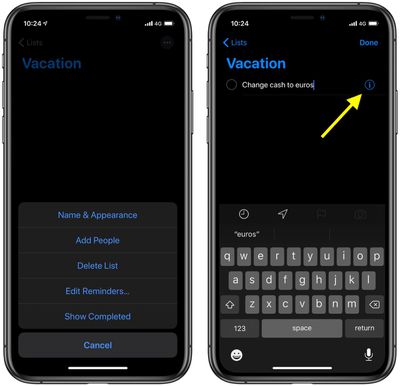 Toque em um lembrete que você criou para editá-lo. Um pequenoinformações(“i”) também aparecerá próximo a ele. Você pode tocar aqui para adicionar notas ao seu lembrete, optar por ser lembrado em um determinado dia e/ou local específico e atribuir a ele um nível de prioridade. A partir daqui, você também pode mover rapidamente o lembrete para outra lista.