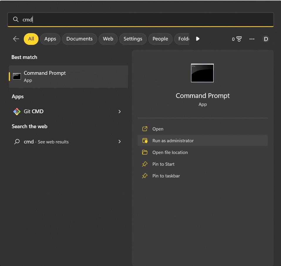 Passo 1 – Vá ao menu iniciar e digite CMD no campo de pesquisa.