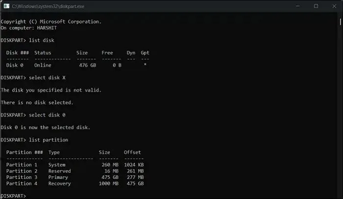3. Selecione a partição primária executando o comando abaixo. Certifique-se de substituir “X” pelo número correspondente à sua unidade principal e pressione Enter: