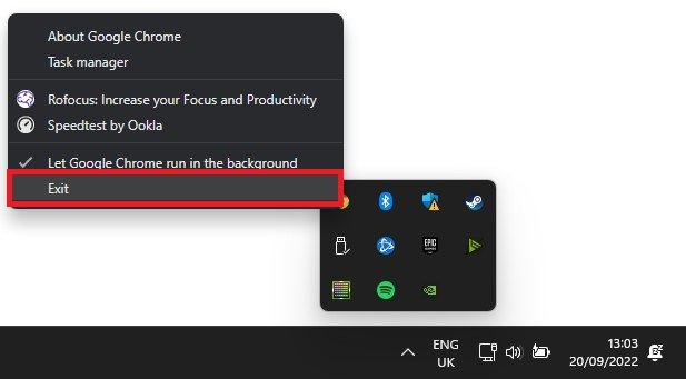 Primeiro, certifique-se de encerrar todos os processos do Google Chrome que ainda estão em execução no seu PC. Para fazer isso, expanda a bandeja do sistema na barra de tarefas. Clique com o botão direito no ícone do Chrome e selecioneSaída. Isso garantirá que o navegador Chrome não esteja em execução no sistema.